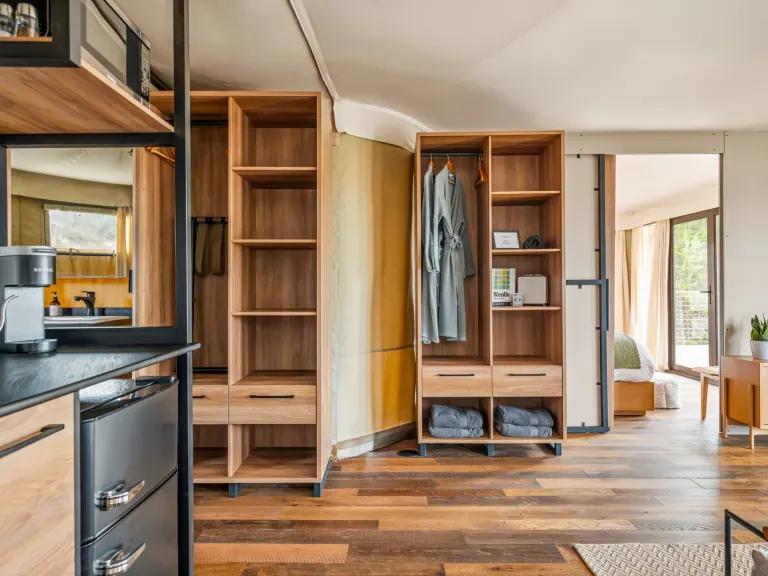 Our luxury glamping lodge features a king canopy bed and two private twin beds, a spa-like bathroom and fully equipped kitchenette. Each suite enjoys heat and AC and outside, fire up the BBQ on the wrap-around deck,  pour a drink from the fully-stocked mini-bar or sit under the heavens around the fire pit. ADA and wheelchair-accessible units are available. Please message your host to inquire about availability.