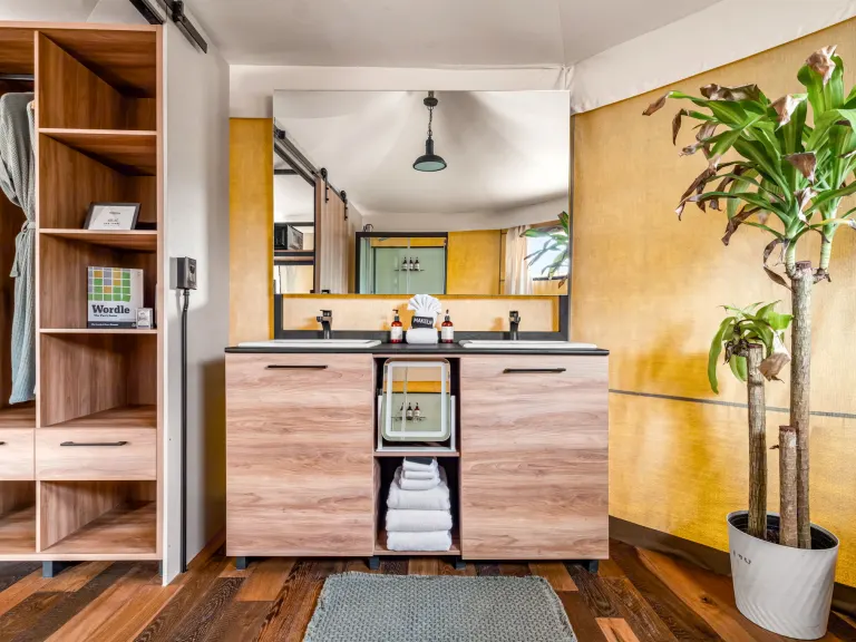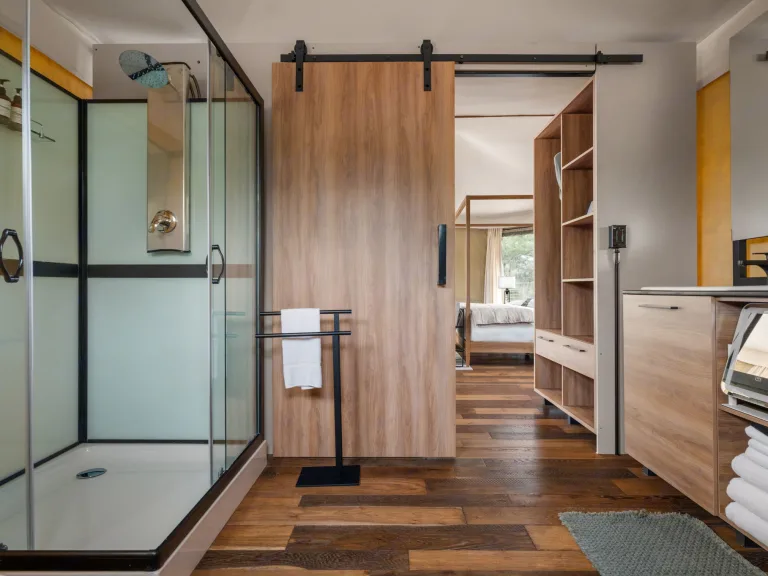 Our Luxury Glamping Suite is a spacious tent with a king canopy bed and a trundle bed, perfect for families or small groups. The private deck has a dining area, lounge furniture, and a fire pit. A fully-equipped kitchenette and modern bathroom complete your stay. Explore the property, from our Sagebrush Bar to our games area.