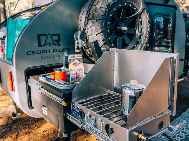Durable Build: Built for the adventurous. This trailer is made to take you to those special, hard to reach places. Need some camping location suggestions? We are happy to help!Cozy Interior: Enjoy a plush sleeping area with a queen-size mattress & large star-gazing window - perfect for cozy nights under the stars. Ample storage space keeps your gear organized and accessible.Fully Equipped Kitchen: Cook up your favorite meals with a convenient galley kitchen featuring a two-burner stove, sink, and prep space. Enjoy dining under the stars with an outdoor kitchen setup, with awning coverage for shade & protection from the elements.Modern Amenities: Equipped with LED lighting, USB charging ports, heated water, and ample ventilation, this teardrop ensures you stay comfortable wherever your adventures take you.Easy Towing: Compact and lightweight, the Vega 2.0 can be towed by a variety of vehicles, making it easy to hit the road on a whim. We provide the hitch and all necessary equipment for safe towing - you just need a hitch receiver and electrical connection. We also offer delivery within 100mi radius of Flagstaff if you prefer not to tow yourself!Rental Details: