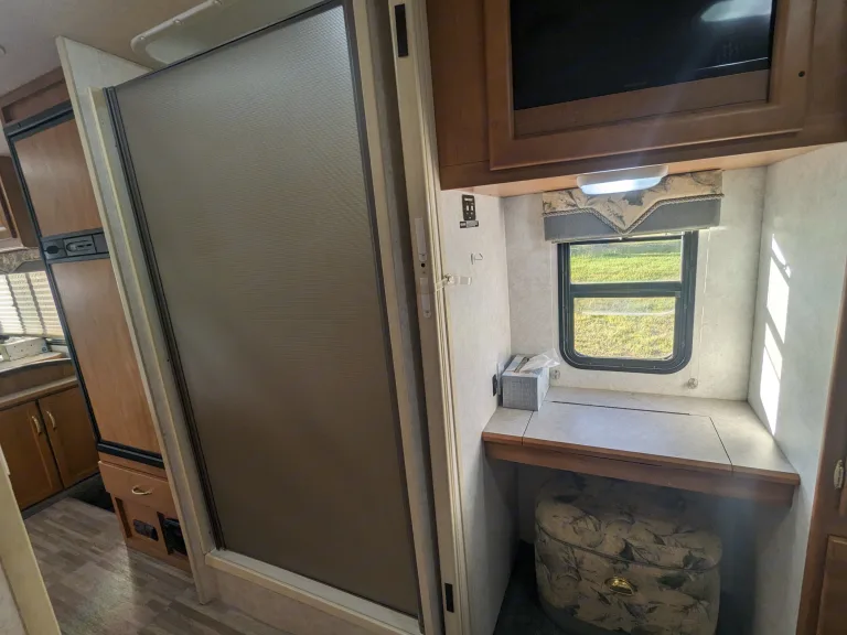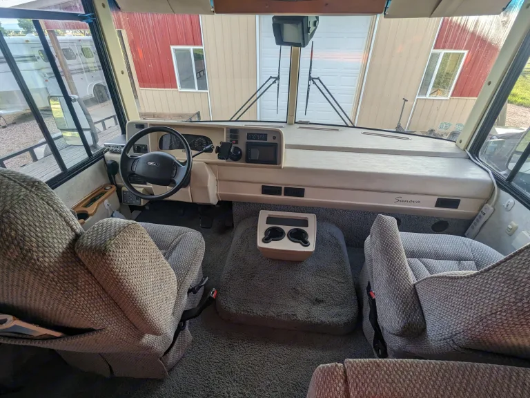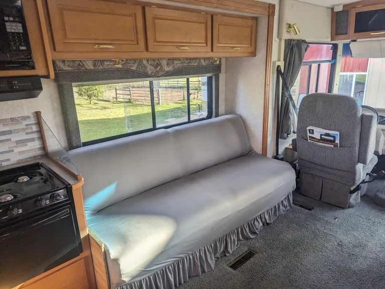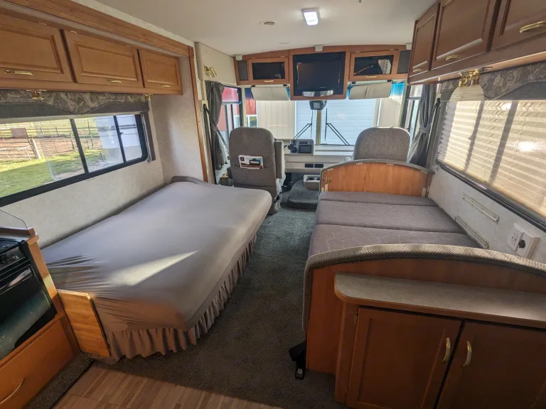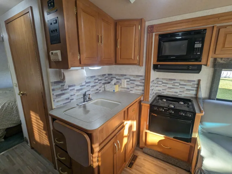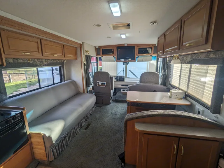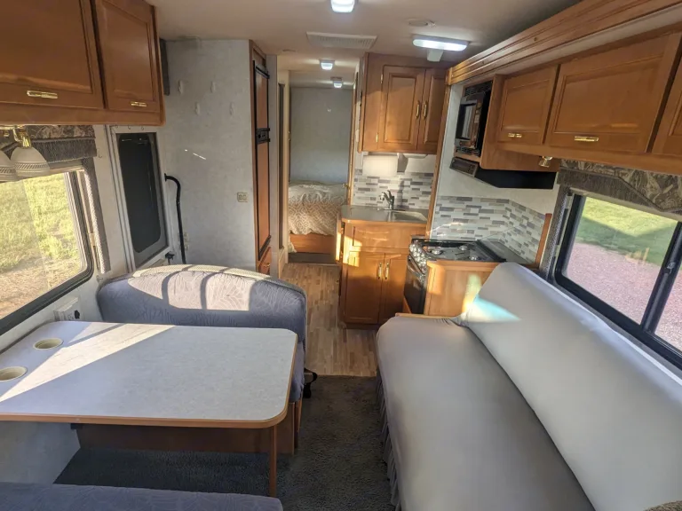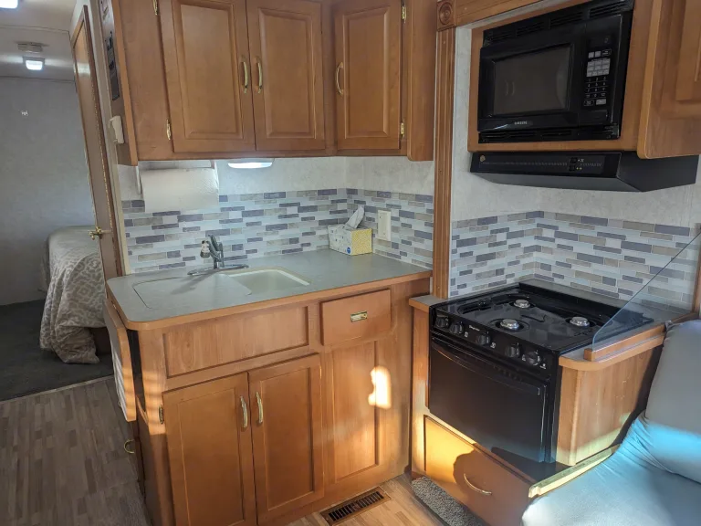 We bought our RV to be able to get out and travel the country, while having the comfort of bringing what we may need with us. If you are looking for a Class A with ease, comfort, and confidence in drivability, this is the RV for you. This rig is 29ft and is small enough to enter and park in all state/national parks. Because it is only 29ft., it also makes it easier to maneuver than some of the longer rigs. This rig allows 6 adults to sleep comfortably and 7 with a kid or two. There are 7 seat belts making it great for family or group camping trips. Our Rv is self contained and equipped with a shower, bathroom, refrigerator and freezer, microwave, stove top, oven, AC and heater, and a double sink.