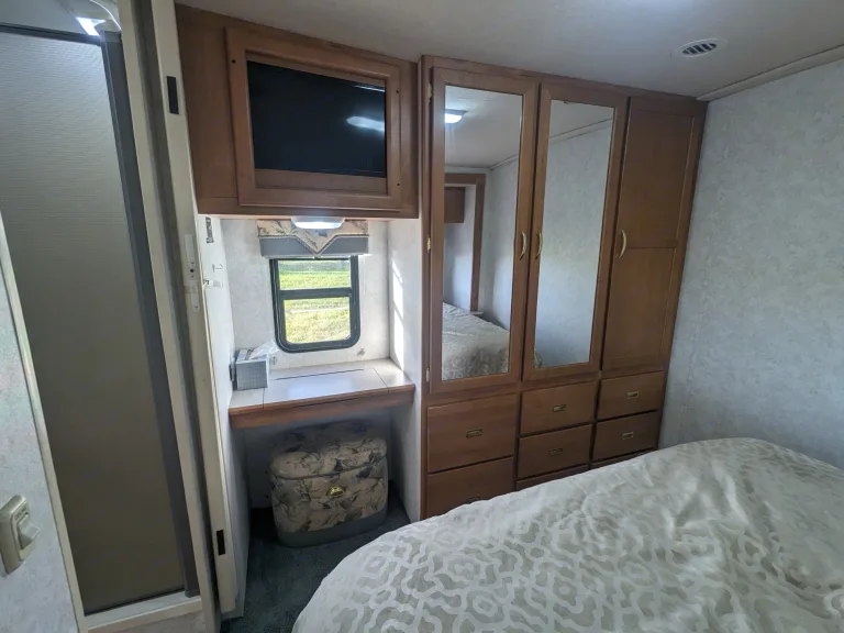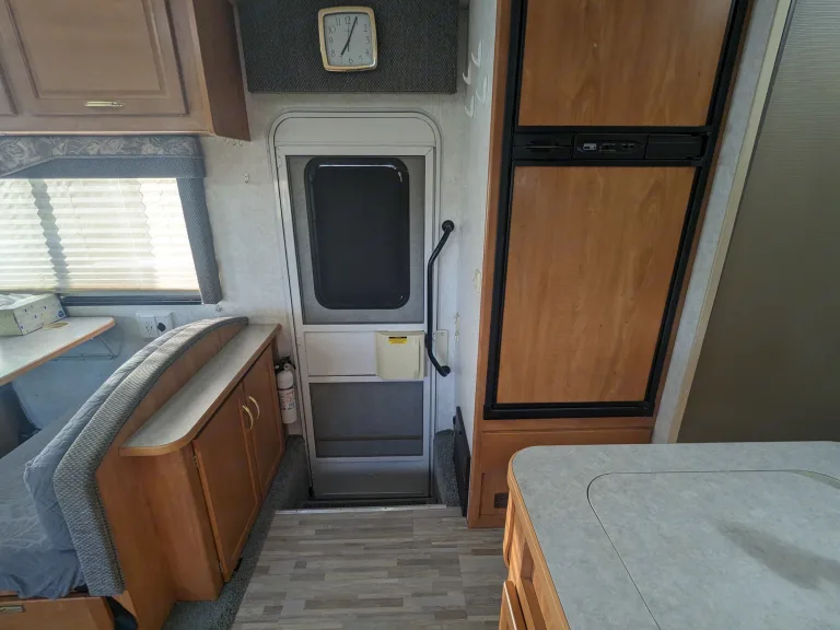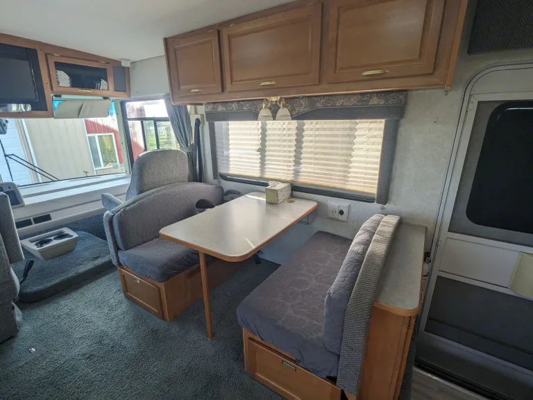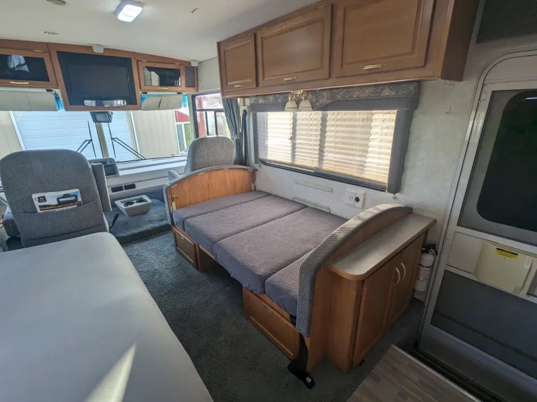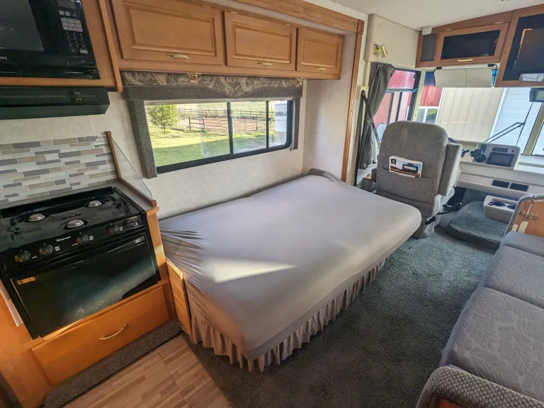 You have plenty of room for sleeping, cooking, and cleaning. This rig has two slide outs, one for the bedroom with a full queen bed and room to walk around, and a slide out for the living space with a dinette/ bed and a jackknife couch for lounging during the day and sleeping at night.