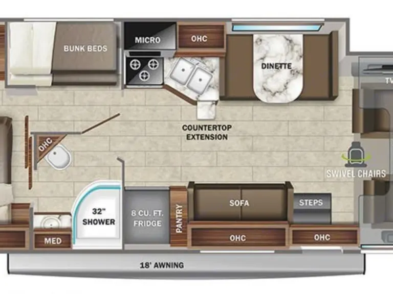 Ready to hit the road with everything you need built right in? The Cozy Epic Journey is a 2022 Jayco Grey Hawk 31F Class C bunkhouse motorhome that sleeps up to 8 guests and delivers the ultimate road trip experience! With a modern interior, one large slide-out for extra space, a spacious above-cab bunk (800 lb. capacity!), and TVs throughout (outdoor, living room, bedroom, and bunkroom!), this motorhome is perfect for families who want to drive to their destination and start enjoying the moment they arrive. Powered by a Ford E-450 7.3L V8 engine with 350 HP, equipped with an Onan® gas generator, cruise control, backup camera, and a towing hitch (7,500 lb. capacity), the Cozy Epic Journey gives you the freedom to explore anywhere. Plus, with an outdoor TV, electric awning, outdoor shower, and plenty of storage inside and out, this allergen-free motorhome brings all the comforts of home on every mile of your journey!