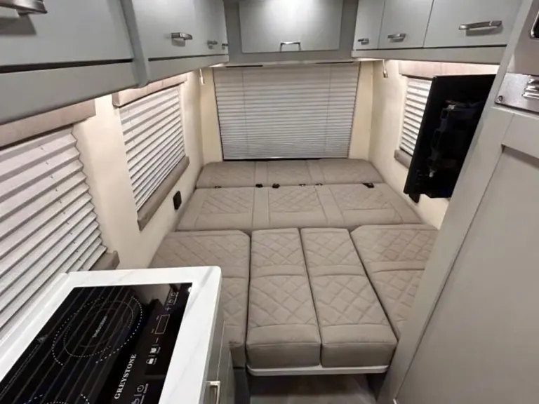 Compact rv rental interior with a cozy, segmented bed, induction cooktop, and ample overhead storage.. Forest River Coachmen Galleria 2025