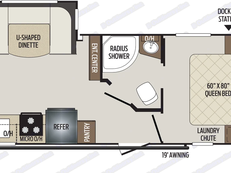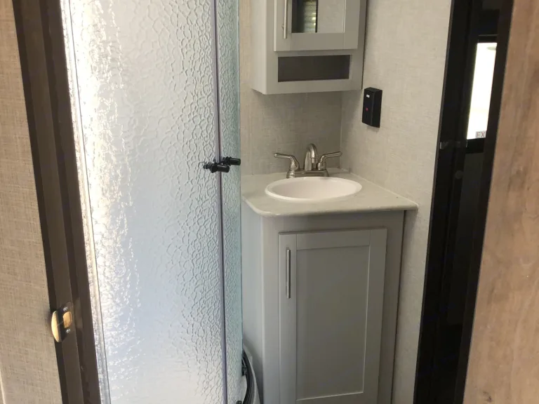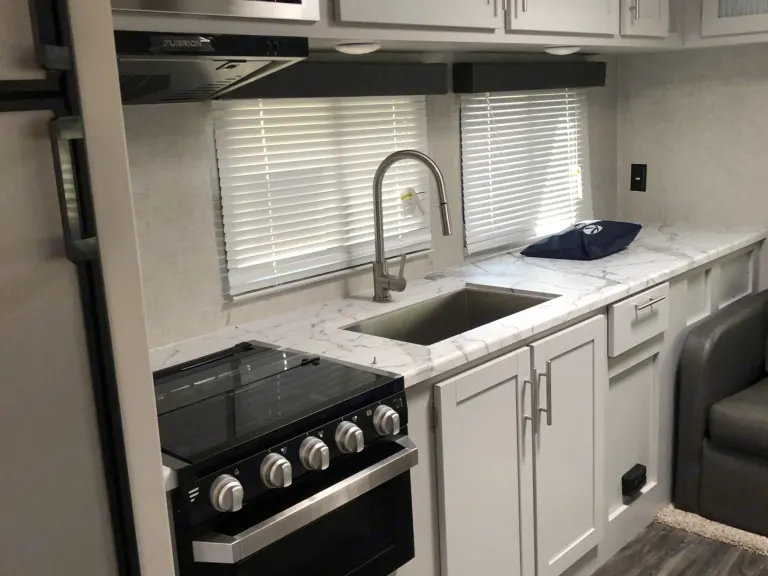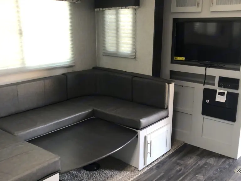 Spacious with a slideout, yet able to fit in the average campsite. Plenty of counter space to prepare meals in the kitchen. Plenty of extra outlets for charging electronic devices or using kitchen appliances.