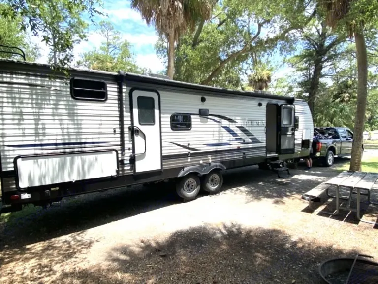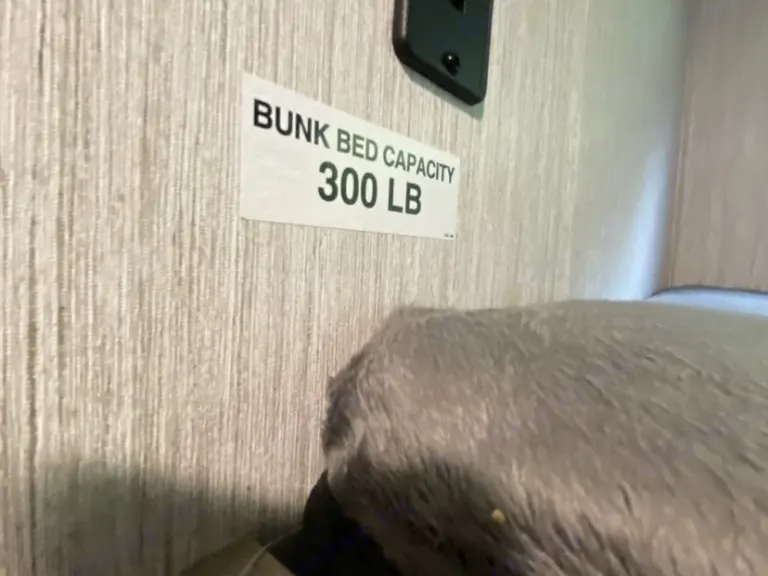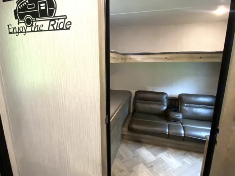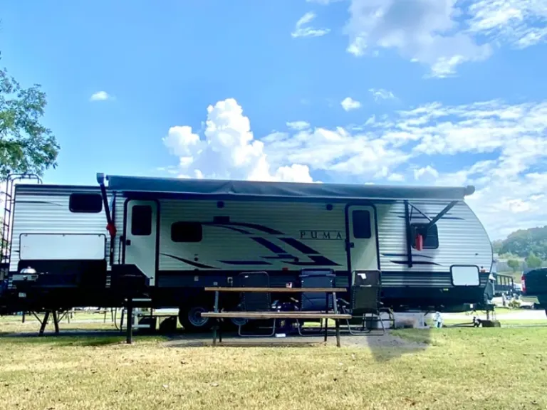The 2021 Puma 28Bhss is a family-friendly travel trailer designed for comfort, storage, and functionality. Measuring just under 37 feet in length, it offers a spacious layout with a large slide-out that opens the central living and kitchen area.Up front, the private master bedroom includes a queen bed with shirt closets on both sides, overhead storage, and its own exterior entry door for added convenience.The rear bunkhouse makes this model especially family-oriented, featuring double bunks and a small seating area/sofa that converts to additional sleeping space. Across from the bunks, there’s storage space for clothes, games, or gear.In the middle, the U-shaped dinette and jackknife sofa sit in the slide-out, giving plenty of seating for meals or movie nights, and both convert into sleeping spots. The kitchen includes a refrigerator, three-burner range, oven, microwave, and a walk-in pantry for extended trips.The bathroom is centrally located with a shower, vanity, toilet, and direct outdoor access, which is a big plus when camping with kids—no need to track through the whole trailer after playing outside.For outdoor living, the Puma 28Bhss offers an exterior kitchen (mini fridge, sink, and griddle in most units), a power awning with LED lighting, and outside speakers. Dual entry doors improve traffic flow, with one opening directly into the bath and the other into the bedroom/living area.With a dry weight around 7,500 lbs and a cargo capacity of about 1,500 lbs, it’s a solid choice for families who need multiple sleeping zones without sacrificing comfort or storage.In short: it’s a bunkhouse travel trailer with room for 8–10 people, two entry doors, outdoor kitchen, and a balance of private and communal spaces, making it popular for family camping.