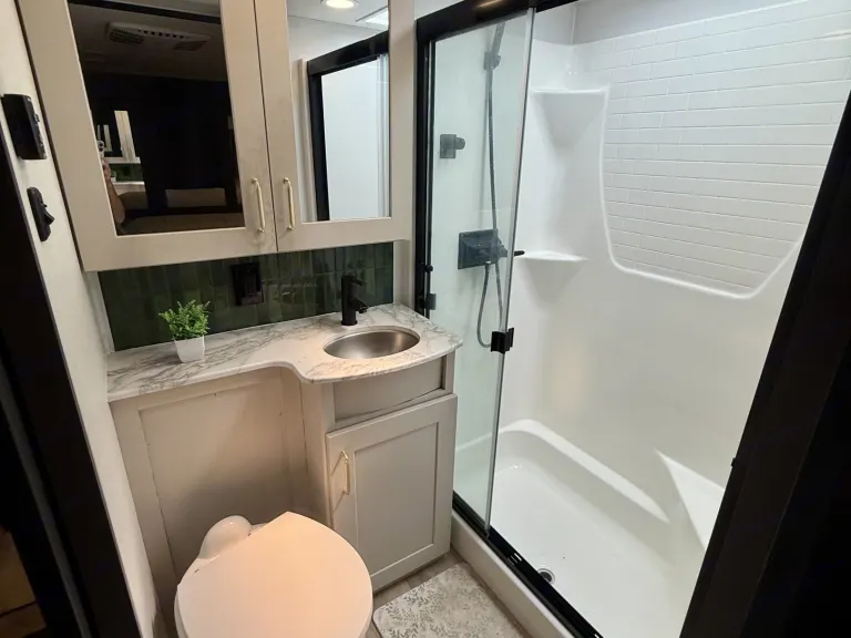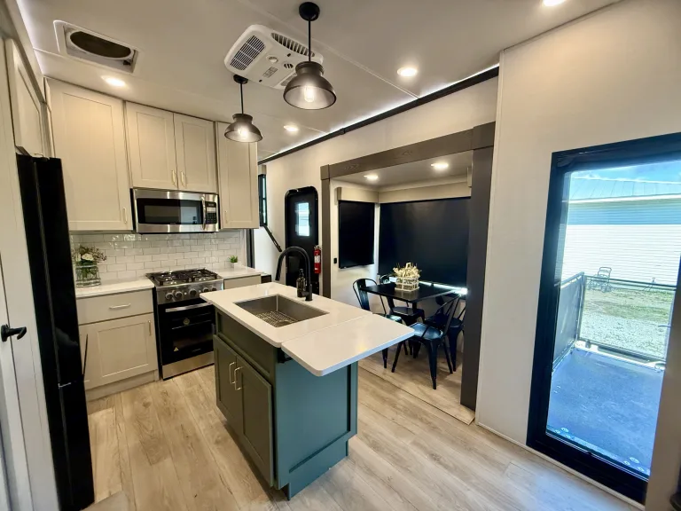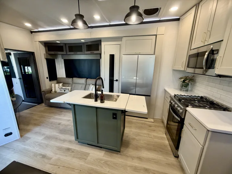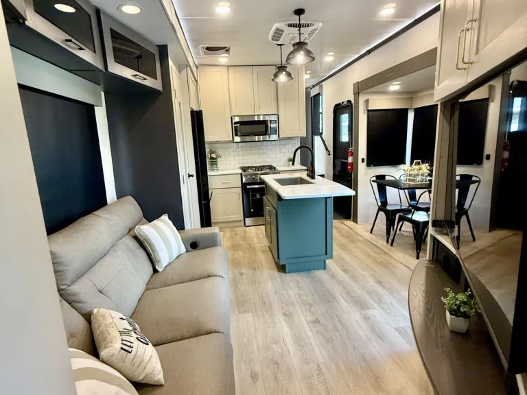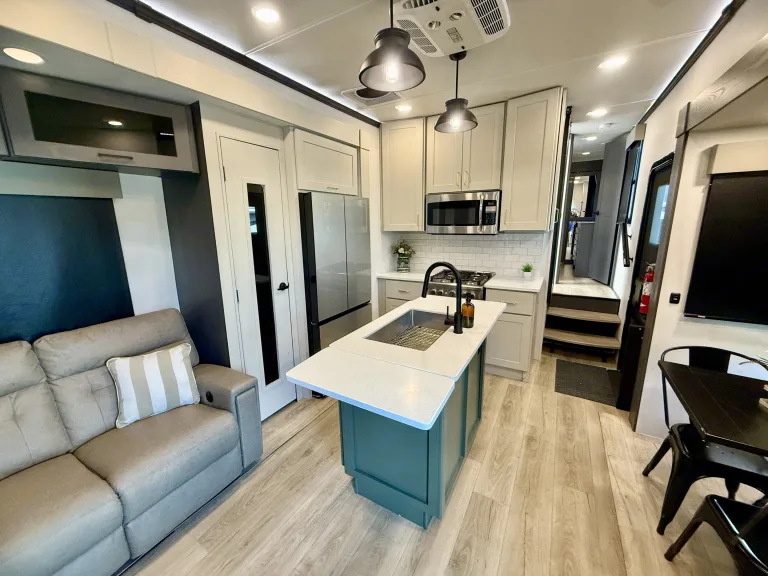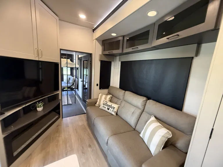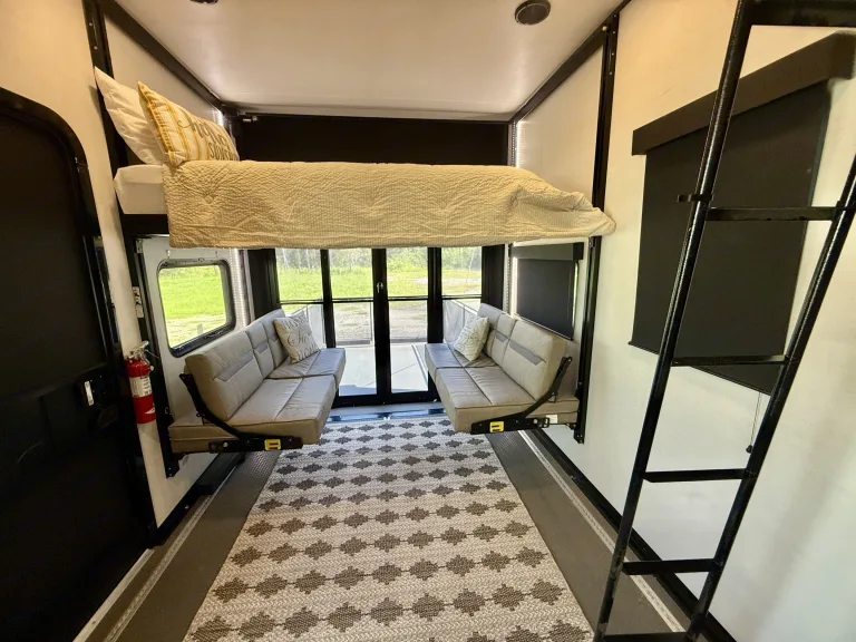 • Includes HappiJac rollover sofas, a queen bed above, and a half bath, offering added comfort or sleeping space.2. Comfortable Living Quarters