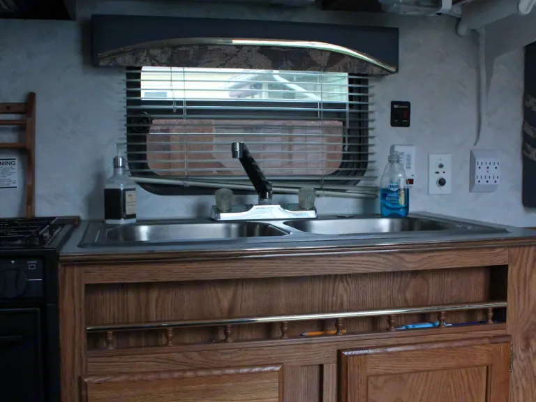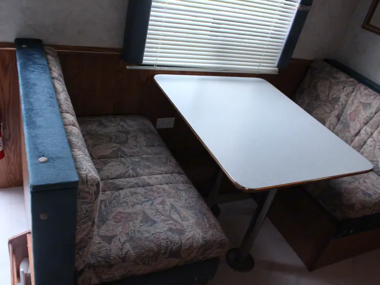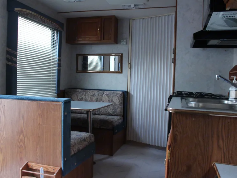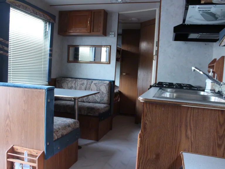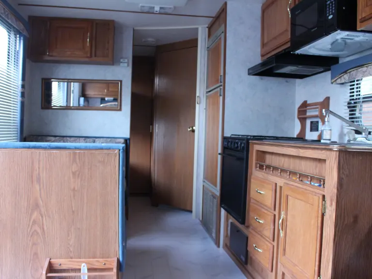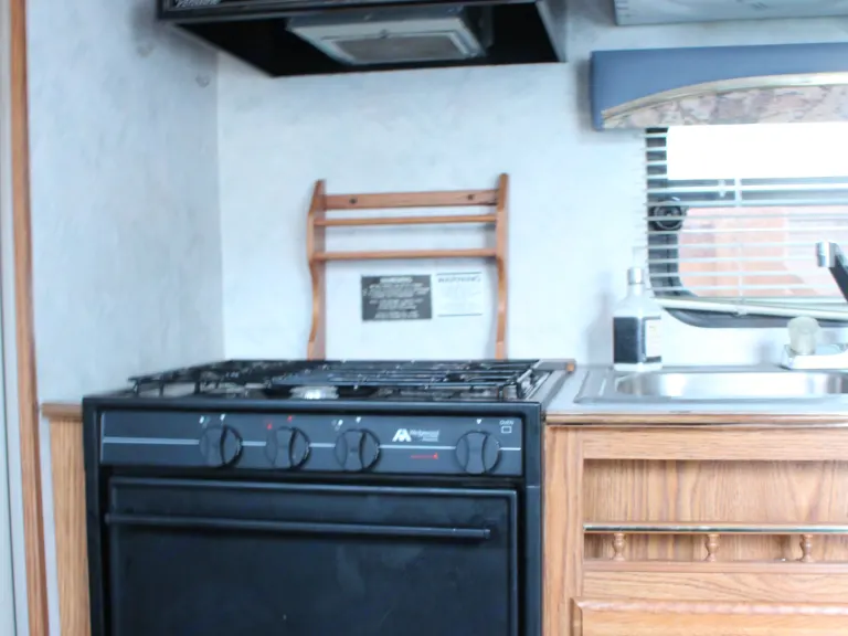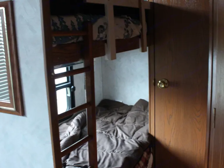 Camp with the whole family in this bunkhouse style travel trailer. Two bunks, a full bed with an upgraded mattress, and a table that folds down will sleep 4 single, 6 if you double up on the table and couch beds, and 7 if you put a little one in the fold-down bunk at the front of the trailer. Dry weight is approximately 3800 pounds, so it will be easier to pull than many trailers this size. Two large propane tanks and two batteries will keep you going for your extended camping trips. Comes stocked with utensils, plates, and cups. The bathroom is larger than most other trailers. That along with the curtain in the back will give you a nice space if privacy is needed. The kitchenette has a three burner stove, oven, refrigerator that can work on either propane or electricity if plugged in, and a double sink. If plugged in there is also a microwave and air conditioner to help keep you fed and comfortable. Our family loves this trailer, and yours will too.