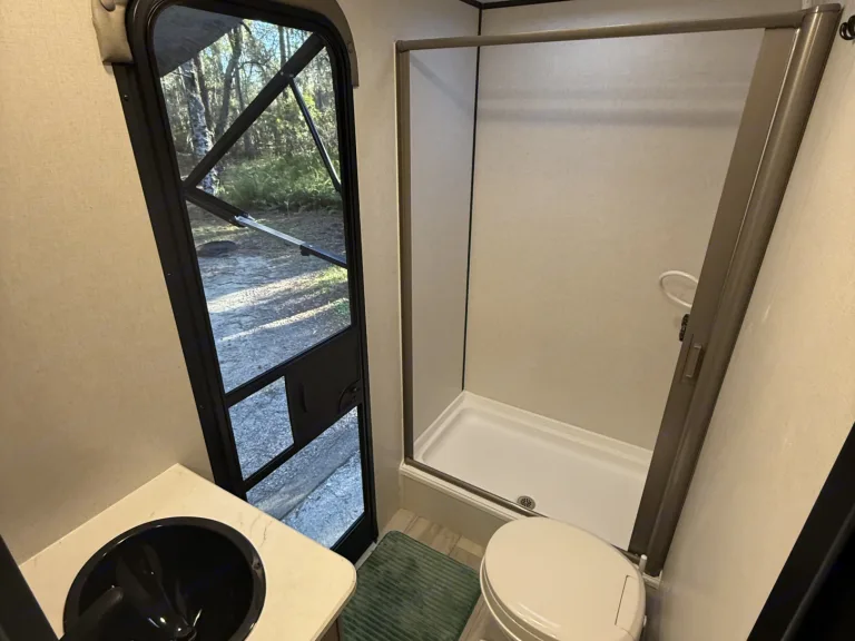 Welcome to your second home! As you approach the camper, you'll notice the charming double entry doors. Step through the main door and ascend three stairs to the main deck, where you'll be greeted by a spacious and open kitchen and entertainment area, complete with all the necessary amenities. Behind the kitchen, you'll find the bathroom, which conveniently has a second entry door leading outside.Adjacent to the bathroom are three comfy bunks, each with steps that double as cubicles for extra storage. If you need even more space, there are storage compartments beneath each bunk. Just in front of the bunks is a modern dinette, perfect for hosting meals with your guests. This dinette can also transform into a bed, with additional storage underneath.One of the best parts of the camper is the cozy couch that faces the TV, where you can enjoy watching your favorite team, catching a movie, or simply playing some music. After a long day, you'll find relaxation in the master bedroom, accessible through the French doors at the front of the kitchen. The bedroom boasts a very comfortable bed, charger ports on each side, and even more storage beneath the bed.This camper is designed with an amazing amount of storage compartments to hold all your belongings, ensuring you have everything you need for a comfortable and enjoyable stay.What's included• 4 folding chairs