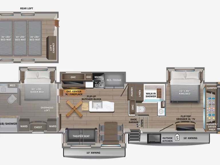 Enjoy this luxury two-bedroom suite complete with King and Queen sized beds and full finished bathrooms. Towards the rear of the trailer you will find the second bedroom with a spaceous Queen size bed and second ensuite washroom with shower and a separate entrance into the trailer.
