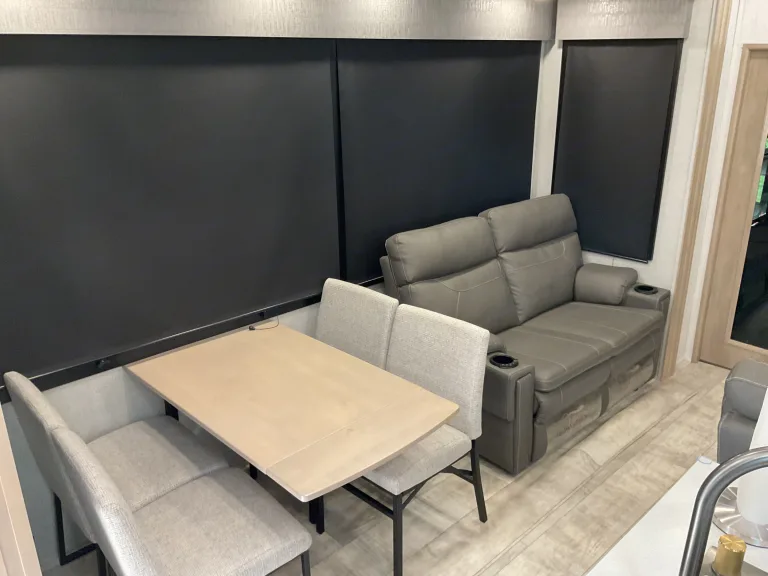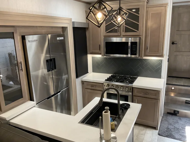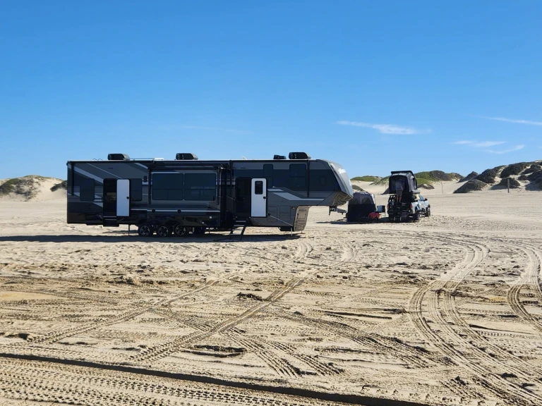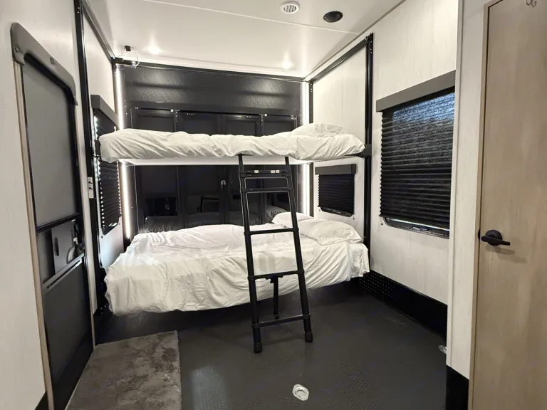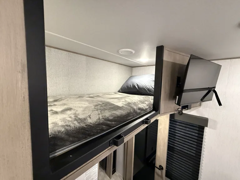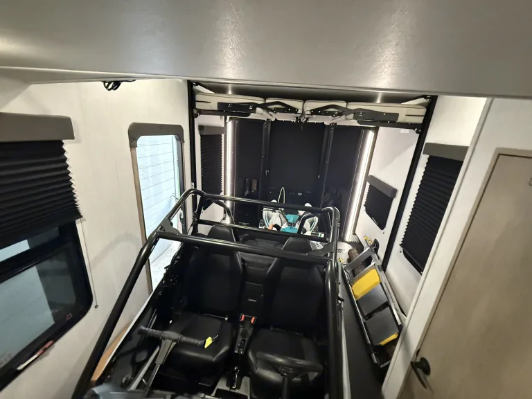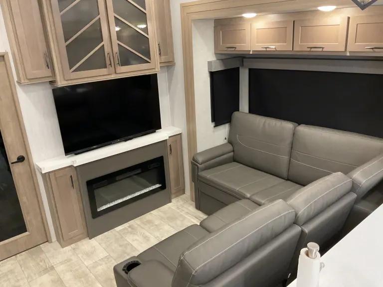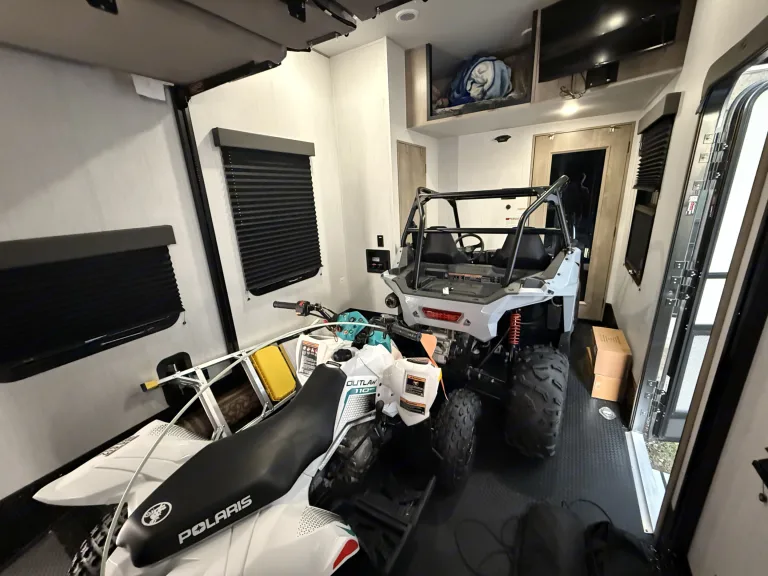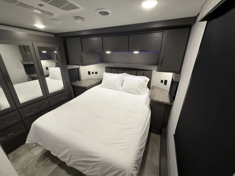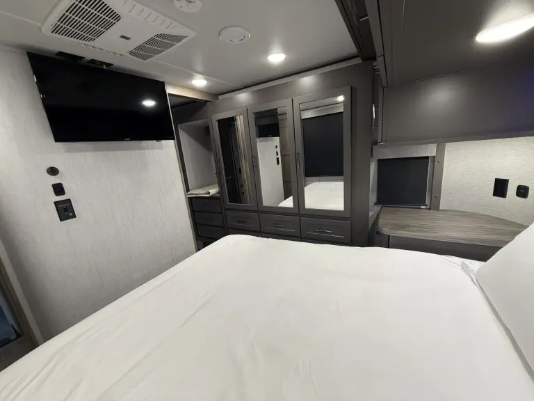 This M-Class Momentum offers the comfort of home while camping. The kitchen includes a full size fridge, 4 burner stove and oven. A microwave for the movie popcorn and a coffee maker for the morning joe. The sectional couch converts to a bed if needed for a guest. The smart TV will connect to your phone’s hotspot so you can watch your favorite show on the beach. The bedroom has plenty of storage for an extended stay and it’s own Smart TV. The 14 foot long garage doubles as a second bedroom with a half bath for the kids. The lift sweet system queen bunk beds can be set up to sleep 4 people. There is also a loft bed overhead and a Smart TV.What's included• Pots and pans
