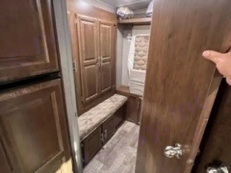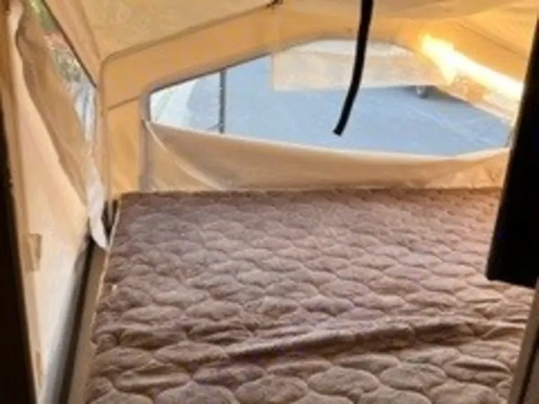 The back bedroom has a slide out closet and privacy door with a queen size fold-out mattress in the tented bedroom.