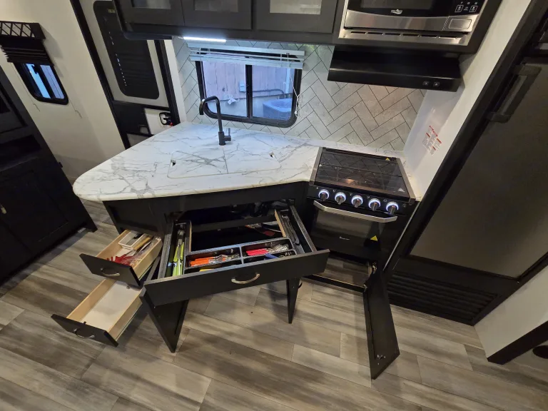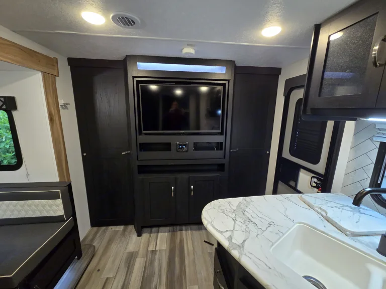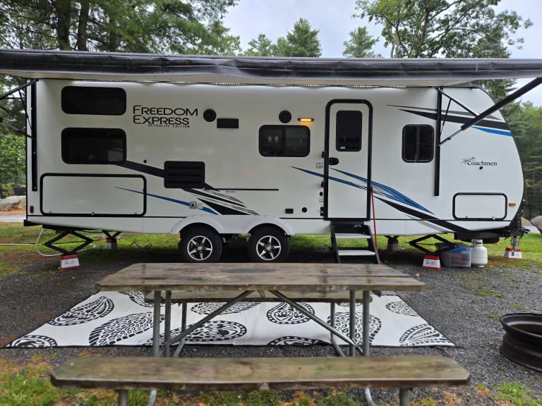 After owning pop up campers over the years we've upgraded this year to this beautiful, modern, lightweight like new camper. Sleeps a family of 5 upto 8. Has a queen bed in privet front room, a slidout with dinner table that turns into a bed (for 2 small ones 1 adult) twin full bunk beds in the back.The queen bed is a comfortable mattress. Bring your sheets pillows and blankets as needed.Has a toilet with shower & sink, hot and cold water, very spacious kitchen with double sink, 3 burner stove, oven,a microwave, 3-way fridge that works with electric/battry/propane, AC and heating both ducked ( much lesser noise then they're regular ones). Fresh water, grey water, and black water tanks. Has a LED lighted power awning, TV that's swings into the bedroom or galley, cable hook-ups radio sound with two speakers inside and two outside, fresh water and sewer hosees, 4 stabilizer jacks, chucks, borch 12×9 rug, and more.