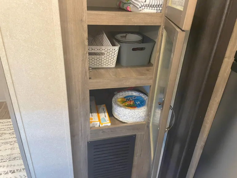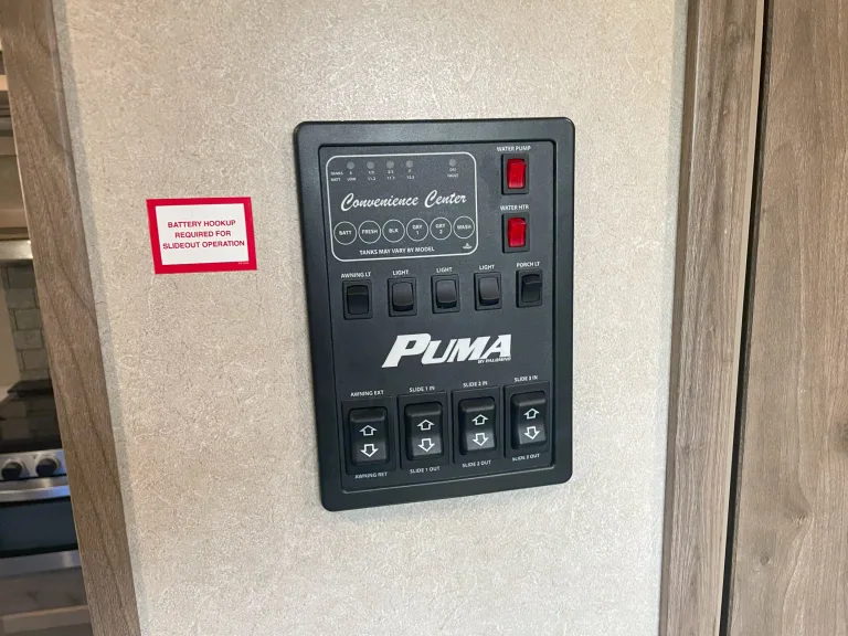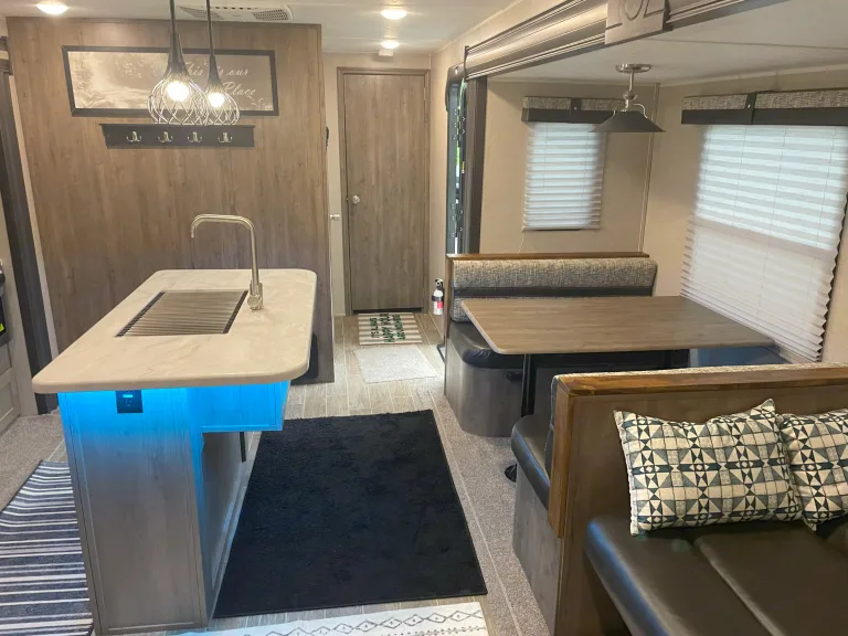 3 Slides Provide a Large Living/Kitchen Area Inside the Camper. The Private Front Bedroom Includes a Queen Size Bed. The Rear Bunk House Includes a Fold Out Couch and a Twin Bed Above Both Sides. The Dinette and Couch in Living Area Also Convert for Additional Sleeping Space.Kitchen Provides a Large Refrigerator/Freezer, Gas Cook Top, Microwave, Sink, and Plenty of Counter Space.Smart TV and Bluetooth Radio in the Living Area Provide Entertainment. Stereo Can Also Be Used on the Outdoor Speakers.The Outdoor Kitchen Includes a Microwave, Induction Cook Top, Sink and Mini-Fridge.50 AMP Electric Hookup. What's included• Basic Linens Including Some Bedding and Some Towels.
