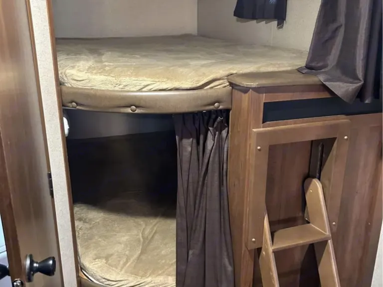 We have a great family-friendly holiday trailer available to rent. It has a full size queen bed with memory foam topper in the front. There are double over double bunks in the back. The couch folds out to a double bed as well, also the table turns into a bed making the trailer sleep a total of 10 people. Bathroom has a shower and additional exterior door. The trailer has a furnace and A/C. Full kitchen as well as well. Includes all dishes, utensils and cookware. Lots of seating and plenty of storage. We keep the trailer very clean as we use it with our own family. Dry weight is 6540 lbs. Gvwr is 9250 lbs. Please make sure your tow vehicle is capable of this. That being said it is easily half ton towable.