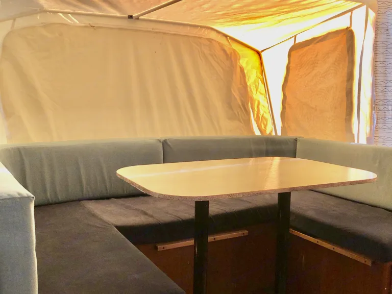 Well cared tent trailer, perfect for a family!!! Dimensions are 19 feet closed and 25 feet opened, with a queen and a king bed featuring heated mattresses. Table and sofa also turn into a bed, so possibility to sleep up to 8 persons.Interesting features: propane water heater, 3 way fridge, fan, lots of storage inside including some cool hooked storage.The trailer comes with all the necessary to an awesome camping trip!!!What's included- Pots and pans